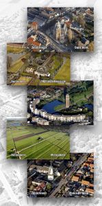 Vijf ansichtkaarten met luchtfoto's van de ‘Old Five’: Oude Kerk, Watertoren, Hoeve Meerzicht, Molen De Hoop en de Meerpolder, ter gelegenheid van de expositie 'Zoetermeer van boven'.